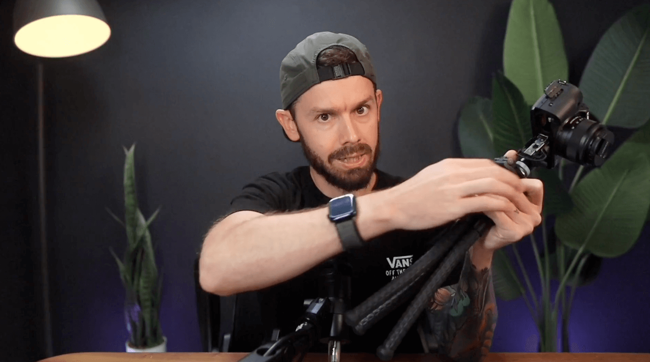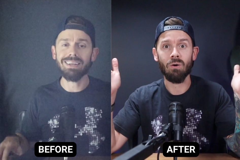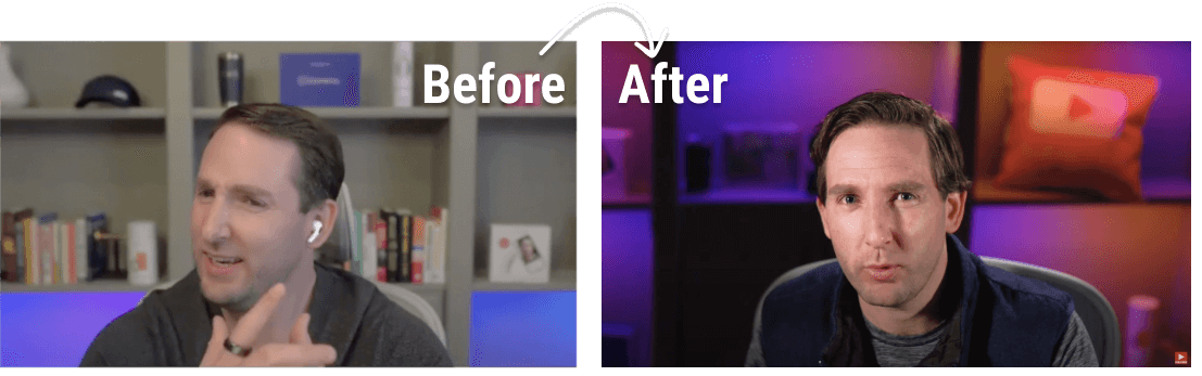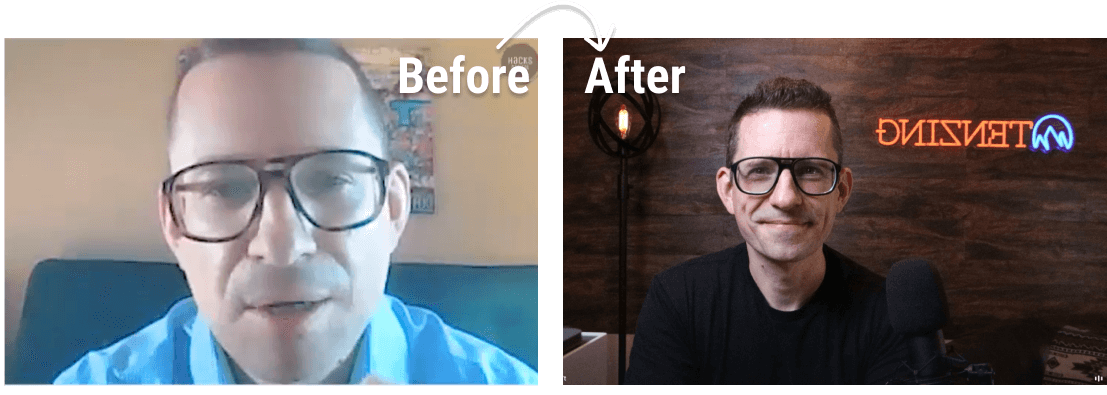 A great camera with bad lighting will have bad quality. (see image to the left) In this lesson, I take you through the entire process, from choosing the right lights to positioning them for a cinematic look. By the end of this lesson, you'll have a thorough understanding of how to use a simple lighting setup to enhance your on-camera presence and create a visually compelling video setup. And we'll do it without taking any floor space at all. This is great if you're like me and hate clutter.